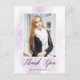 Vielen Dank an Freunde und Verwandte, die zu Ihrem Abschluss gekommen sind, indem sie ihnen ein stilvolles Foto geschickt haben. Der Abschluss dankt Ihnen Postkarten mit einem lila Aquarellhintergrund, Dankeschön in einem trendigen Skript-Schriftart und Platzhalter für Ihren eigenen Text und Bild.