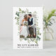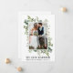 Elegantes Watercolor Greenery Foto Wir Got Verheiratete Wedding Announcement Card beinhaltet Eukalyptus-Blätter und andere schöne botanische Vegetation.
