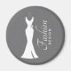Der Modedesignmagnet aus klassisch grauem Hintergrund. Eine grafische Abbildung eines eleganten weißen Gewindels, das an einem Kleiderbügel hängt. Das einfache minimalistische Design.
