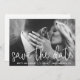 Moderne Foto Save the Date-Karte mit dem kompletten blutenden horizontalen Bild mit einem Typografie-Overlay mit den Worten, "Save the Date" in einem dünnen, weißen Handschrift-Script-Schriftart. Unten ist eine Zeile Text für Ihre Hochzeitsdetails. Die Rückseite hat die Wörter "Einladung zu folgen" im passenden Skript und kann entfernt werden, indem Sie auf die Schaltfläche "Anpassen" klicken. Ein schlichtes und dennoch elegantes Design, das Ihr Foto zum Hauptmerkmal macht.