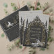 Eleganz in Silber und Schwarz. Dieses Bild zeigt eine Schwarz-Weiß-Abbildung eines Hochzeitsrahmens mit aufwändigen Gold- und Silberverzierungen. Der Rahmen ist mit verzierten Blumenmustern und einem zentralen Bogengang geschmückt. Eine Braut in einem fließenden Gewand, die ein Bouquet hält, steht innerhalb des Rahmens, abseits des Betrachters. Der Hintergrund ist eine strukturierte schwarze Oberfläche, die eine dramatische und elegante Atmosphäre schafft.