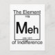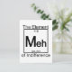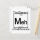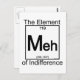 Die Wissenschaft hat eine neue Chemikalie im Periodensystem abgeschieden - das Element der Gleichgültigkeit, abgekürzt als MEH. Diese gemeinsame Substanz zeigt sich als verbaler Schulterzucken, wenn es Ihnen einfach egal ist. Die Slang Chemie für die Massen - ein perfektes Geschenk für.. was auch immer.