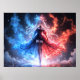 Ein mächtiges Mädchen strahlt duale Energie aus, ihr fließendes Kleid teilt sich zwischen eisblau und feuerrot. Stehend inmitten eines kosmischen Schlachtfeldes strahlt ihre ätherische Aura mit einem anderen Weltenlicht.