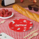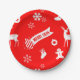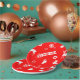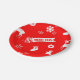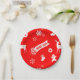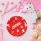 Eine nahtlose weiße Wiederholung von Weihnachtselementen - Strümpfe, Lebkuchen, Schneeflocken, Rentiere, Weihnachtsschmuck, Kerzen, Weihnachtsbaum und die Worte "Frohe Weihnachten" - in der Abbildung, vor einem roten Hintergrund.