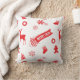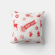 Ein Kissen mit einer nahtlosen, roten Wiederholung von Weihnachtselementen - Strümpfe, Lebkuchenmann, Schneeflocken, Rentiere, Weihnachtsschmuck, Kerzen, Weihnachtsbaum und die Worte "Merry Xmas" - in Abbildung.