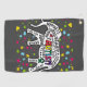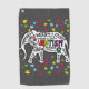 Elephant Autismus Awareness Golf Handtuch Elefant mit aufsteigenden Worten Unterstützung für Autismus. Helle Puzzleteile im Hintergrund. Grauhandtuch