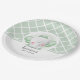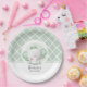 Auf diesen geschlechtsneutralen Baby-Duschpapier-Tellern ist ein bezaubernder Babyelefant mit grünen Ohren und Bogen auf dem Kopf auf einem grün-weiß-schwarzen Rautenmuster zu sehen. Auch in Rosa und Blau erhältlich. PASSENDE Artikel in unserem Geschäft.