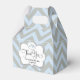 Diese Kiste hat einen Mutter-Baby-blauen Elefanten an der Spitze des Etiketts mit einem großen Dankeschön und die Formulierung "dafür, dass dieser Tag so besonders" darunter. Der Hintergrund ist blau und grau Zickzack.