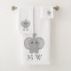 Bath towel set, consisting of a face cloth, hand towel and bath towel with an elephant design. You can customise this bath towel set with any text of your choice. Should you require any help with customising then contact us through the message link on this page. Elephant design bathroom towel set