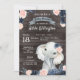 Sehr niedliches kleines Mädchen Elefant mit Navy Blush Pink Roses Holz rustikale Hintergrund Baby Dusche Einladung.