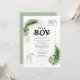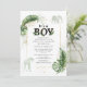 Giraffe zum Thema Wildwald und elegante Jungs Safari Baby Dusche Einladung mit einer Giraffe, einem Elefanten, Goldfolie und grünen Blätter. Perfekt für die Einladungen eines kleinen Jungen mit einer Babydusche