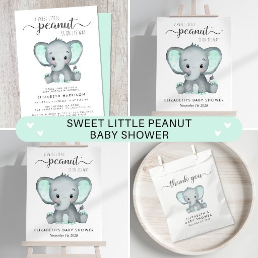 Eine niedliche, geschlechtsneutrale Babydusche mit "A Sweet Little Peanut Is On its Way" in sanft grau moderner Typografie und einem Drehbuch mit Wimpern und einer minzgrünen Wasserfarbe eines Babyelefanten. Personalisieren Sie den Namen der Mutter und die Babydusche Details in schlichter grauer Typografie. Auf Wunsch können Sie auch das Geschlecht des Babys angeben (z. "Ist auf ihrem Weg").