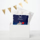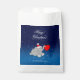 Niedlicher Elefant mit rotem Hut und Tasche mit Weihnachtsgeschenken über blauem Hintergrund mit weißen Schneeflocken