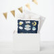 Dieser niedliche und skurrile Liebesbeutel ist mit einem bezaubernden Babyelefanten in einer Goldkrone ausgestattet, der auf einer Wolke mit Sternen sitzt. Im Hintergrund ist ein sterniger Nachthimmel und ein Halbmond. Der Text kombiniert handgeschriebene Skripte mit serifenlosen Schriftart für ein stilvolles und modernes Design. Das ist perfekt für eine Babydusche.