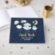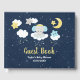 Dieses niedliche und skurrile Gästebuch zeigt einen bezaubernden Elefanten in einer Goldkrone, der auf einer Wolke mit Sternen sitzt. Im Hintergrund ist ein sterniger Nachthimmel und ein Halbmond. Der Text kombiniert handgeschriebene Skripte mit serifenlosen Schriftart für ein stilvolles und modernes Design. Das ist perfekt für eine Babydusche.