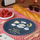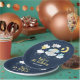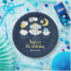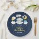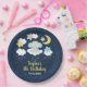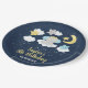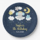 Diese niedliche und skurrile Platte zeigt einen bezaubernden Babyelefanten in einer Goldkrone, der auf einer Wolke mit fallenden Sternen sitzt. Im Hintergrund ist ein sterniger Nachthimmel und ein Halbmond. Der Text kombiniert handgeschriebene Skripte mit serifenlosen Schriftart für ein stilvolles und modernes Design. Das ist perfekt für eine Geburtstagsfeier.