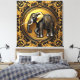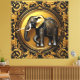 Ein majestätischer, schwarzer Elefant, symbolisiert Stärke und Weisheit, wird vor einem Hintergrund von aufwändigen goldenen Zierrahmen dargestellt, der ein Gefühl von Großzügigkeit und Eleganz ausstrahlt. Der Kontrast zwischen der dunklen Silhouette des Elefanten und den schimmernden goldenen Details des Rahmens schafft ein visuell auffallendes und faszinierendes Bild.