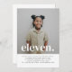 Eine einfache Einladung zum 11. Geburtstag mit eigenem Foto und den Worten "elf" über dem Gipfel.