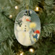 Einer der Elfen des Weihnachtsmannes hält eine beleuchtete Kerze bereit, damit ein Schneemann sie sehen kann. Eines der niedlichsten Viktorianischen Urlaubsszenarien, das Weihnachten auf die altmodische Art und Weise feiern hilft! Beide Seiten dieses Ornaments haben das gleiche Bild.