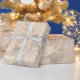 Schimmerndes Elfenbein und Gold bedrückten Vintagen Damast mit alten Vintagen Typografie Geschenkpackung.