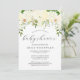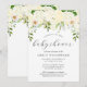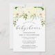 Eine wunderschöne Blumenstruktur aus Elfenbein und cremefarbenen Hydrangeas, Rose und Pfannkuchen, die mit Grün ausgehen, erscheint über dem Wort "Babydusche" in der eleganten handgeschriebenen Schrift Holzkohle grau. Passen Sie die Erholung des Textes mit dem Namen der Mutter-zu-sein, Datum, Ort und UAWG Details an. Ideal für eine Frühjahr- oder Sommerdusche.