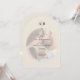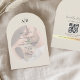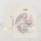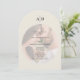 Elegante und moderne bogenförmige Hochzeitseinladung mit einer romantischen Foto-Überlagerung und einem minimalistischen Monogramm oben.
