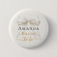Feiern Sie Ihren besonderen Meilenstein mit diesem schicken Junggesellinnenabschied-Button. Das Design zeigt ein luxuriöses elfenbeinfarbenes Band, das mit zarten Perlensträngen und einer anspruchsvollen goldtönigen Schrift verziert ist. Es dient als stilvolles Accessoire für die zukünftige Braut, das sie während ihres Brautabschieds oder eines Abends mit den Brautjungfern tragen kann. Elfenbeinfarbene Hintergrundfarbe.