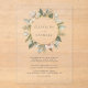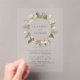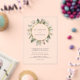 Diese elegante Hochzeitseinladung zeigt einen goldenen Kreis, umgeben von einer blumengeschmückten Aquarellbilderei mit Elfenbein-Rose und Grün auf einem durchsichtigen Hintergrund. Passen Sie den grauen Holzkohle-Text mit Ihren Hochzeitsdetails an.