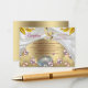 Einzigartige personalisierte Einladungskarten mit Perlen und goldenen Ringen, die durch Elfenbeinseide mit goldenem Hintergrund getrimmt werden.