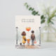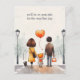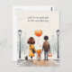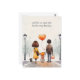 Eine niedliche Postkarte von hinten in der Schule mit einer Abbildung eines niedlichen Schulmädchens, das bei seinen Eltern Händchen hält, und mit dem Standardtext "Wir sind für den ersten Tag auf Ihrer Seite!". Die Familie wird von einem Welpen begleitet.