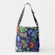 Bolso bandolera azul con estampado integral con patrón de fantasía con elementos botánicos y formas abstractas, donde los elfos y sus máscaras se mezclan entre el aleteo de las mariposas