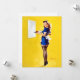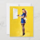 Elvgren Button Up Girl Art. Eine in einem Retro-Outfit gekleidete Kellnerin hält ein Tablett mit Dampfbecher und Konditorei, Set vor einem hellgelben Hintergrund. Ihr Kleid umfasst ein blaues Kleid, Strümpfe und eine kleine weiße Schürze, die eine Vintage Ästhetik verkörpert.