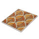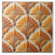 Die Fliesen sind nahtlos im Art-Déco-Stil gehalten und in Orange- und Braun-Tönen gestaltet. Die Fliesen sind in einem hellen beigen Hintergrund mit einer gehobenen, stilisierten Blume oder einem Blattwerk gestaltet. Die Gestaltungselemente haben eine dreidimensionale Qualität, was darauf schließen lässt, dass sie geformt oder geformt sind. Die Farbpalette ist warm und einladend.