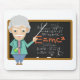 Cooles und lustiges Design mit einem Wissenschaftslehrer, der einen Chemiefaser hält, und einem Stock, der auf die Tafel mit der EMC2-Formel und verschiedenen anderen Formeln zeigt.