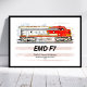 Illustrated depiction of the EMD F7 locomotive showcases Santa Fe warbonnet colors, American flag textures, and rugged diesel power. Celebrating postwar railroading, the artwork highlights industrial optimism, engineering heritage, and timeless design, capturing motion, strength, and nostalgia for classic midcentury railroad innovation through bold composition and historical accuracy today vividly.