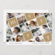 EMELIA Gold Moderne Familie Multi Foto Weihnachtskarte. Personalisieren Sie die Vorderseite der Karte mit 10 Fotos, Ihrem Familiennamen und dem Jahr. Personalisieren Sie den Rücken mit einem optionalen Urlaubsgruß oder Familiennachrichten und Ihrem Familiennamen.