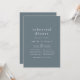 Dieses Vintage, staubige Abendessen in blauer Probe aus der Emelia Collection eignet sich hervorragend für eine moderne Hochzeitsfeier. Das minimalistische Design zeichnet sich durch eine einfache, aber stilvolle Typografie auf Schieferblau-grau mit einer Atmosphäre moderner Eleganz aus.