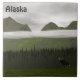 Ein "primitives" oder volkstümliches Gemälde aus grünem Nadelholz und Bergen an einem sehr grauen Tag mit niedrigen Hängewolken. Ein BullenElch (Alces alces) im Vordergrund verleiht der Szene eine Skala. Auch "Alaska" erscheint als anpassbarer Text.