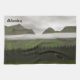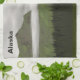 Ein digitales Bild von grünen Nadelbäumen und Bergen in Alaska an einem sehr grauen und bewölkten Tag. Ein BullenElch im Vordergrund verleiht der Szene eine Skala. Es erscheint auch das Textlesen "Alaska".