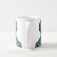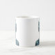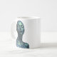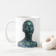 Futuristic green-toned metallic female android with closed eyes, centered on a white mug.