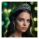 Ein fotorealistisches digitales Portrait einer schönen jungen Frau mit auffallenden blauen Augen und fließendem dunklem Haar. Eine dramatische gespaltene Beleuchtung verstärkt ihre Eigenschaften, da sie eine große Platintiara, Keilohrringe und eine skulptierte Halskette mit lebhaften Smaragden, Peridots und Diamanten trägt. Sie ist in einem tiefgrünen Waldkleid verkleidet und ist Set vor einem sanft verschwommenen Hintergrund leuchtender Galalichter, die ein Gefühl von Eleganz und Luxus schaffen.