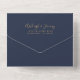 The left-hand edge of this elegant modern all-in-one wedding invitation and RSVP features an emerald green watercolor agate border trimmed with faux gold glitter. The customizable text combines gold-colored whimsical handwriting, copperplate and italic fonts on a navy blue background. The return address appears on the outside flap and the reverse side of the detachable RSVP card in gold-colored text on solid navy blue. A QR code is included on the RSVP card for guests who would prefer to reply online.