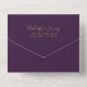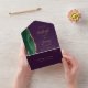 The left-hand edge of this elegant modern all-in-one wedding invitation and RSVP features an emerald green watercolor agate border trimmed with faux gold glitter. The customizable text combines gold-colored whimsical handwriting, copperplate and italic fonts on a purple background. The return address appears on the outside flap and the reverse side of the detachable RSVP card in gold-colored text on solid purple. A QR code is included on the RSVP card for guests who would prefer to reply online.