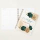 Beautiful wedding planner featuring emerald green and beige gold flowers with green leaves .