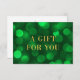 Geschenkgutschein-Karte mit den Worten "Ein Geschenk für Sie" in Imitaten goldene Folie vor einem smaragdgrünen Buh Lichter Muster Hintergrund auf der Vorderseite. Personalisieren Sie diese Karte mit Ihren Daten, indem Sie den Platzhalter-Text ersetzen. Für weitere Optionen, wie zum Beispiel den Schriftart, die Textgröße/Schriftfarbe oder den Abstand zwischen den Buchstaben zu ändern, klicken Sie auf die Schaltfläche "Anpassen". *Bitte beachten Sie, dass das Zazzle-Wasserzeichen, das in der Zoomvorschau angezeigt wird, NICHT auf dem gedruckten Endprodukt erscheint. © Rosewood and Citrus