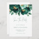 Emerald Green und Gold Florals QR Code Hochzeit. Herrliche grüne Blumen und Blätter und ein elegantes Set-Skript für Save the Date. Die Erholung des Textes können Sie einfach mit Ihren Daten personalisieren. Fügen Sie Ihren QR-Code zu Ihrer Hochzeitswebsite auf der Rückseite oder löschen Sie diesen und den Text auf der Rückseite, wenn nicht erforderlich. Verfügbar in digitaler Form oder gedruckt.