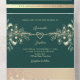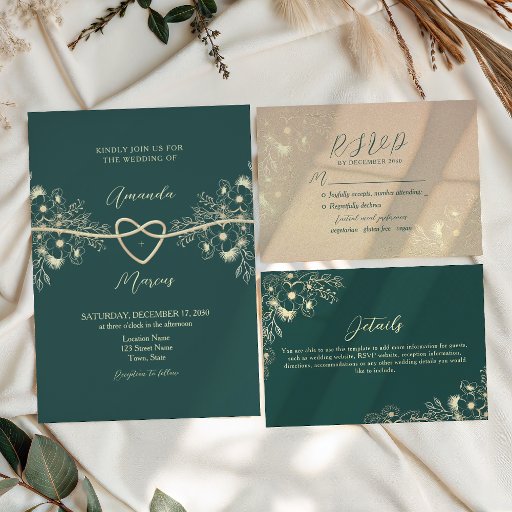 Elegante Einladung zur Hochzeit in smaragdgrün mit goldenen Blumenakzenten und einem romantischen Seilherz-Monogramm. Das Design beinhaltet Platz für Hochzeitsdetails, eine abnehmbare RSVP-Karte und ein personalisiertes Foto zurück. Bitte beachten Sie: Diese Einladung ist nicht selbstversenden und erfordert einen A9-Umschlag. Eine moderne, koordinierte Wahl für Paare, die Stil und Komfort in einer Karte gewollt haben.