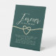 Elegantes, schlichtes smaragdgrünes Hochzeitstiefeldschild mit Imitaten goldenes Seilherz und moderner Kalligraphie-Schrift.