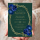Dieses Design besticht durch einen geometrisch goldenen Rahmen, der mit königsblauen Aquarellbouquets und Grünpflanzen dekoriert ist und goldfarbenen Text auf einem smaragdgrünen Hintergrund umgibt. Die Rückseite der Karte ist ein passender Schatten von Smaragdgrün.