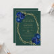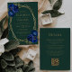 Dieses Design besticht durch einen geometrisch goldenen Rahmen, der mit königsblauen Aquarellbouquets und Grünpflanzen dekoriert ist und goldfarbenen Text auf einem smaragdgrünen Hintergrund umgibt. Die Rückseite bietet Platz für Hochzeitsdetails auf einem soliden smaragdgrünen Hintergrund, zusammen mit einem QR-Code können Gäste scannen, um Ihre Website und UAWG, die die Kosten für den Druck und Versand separater RSVP-Karten rette.